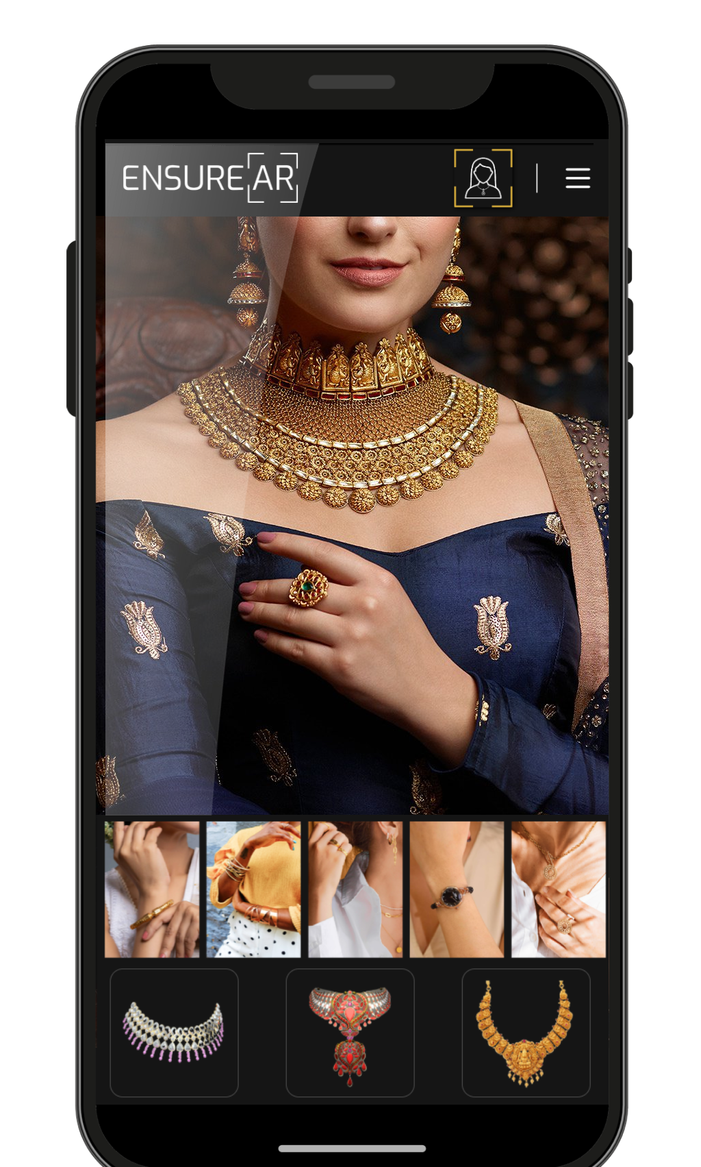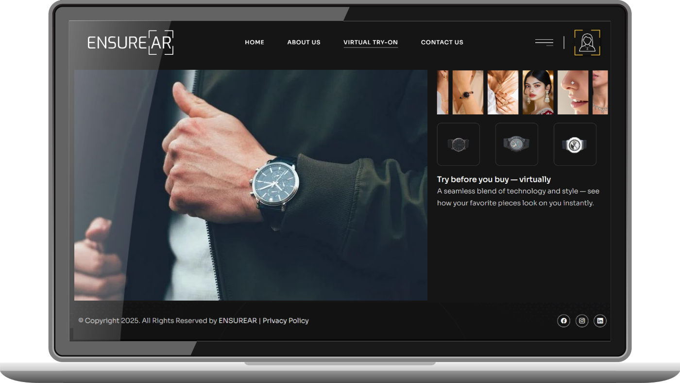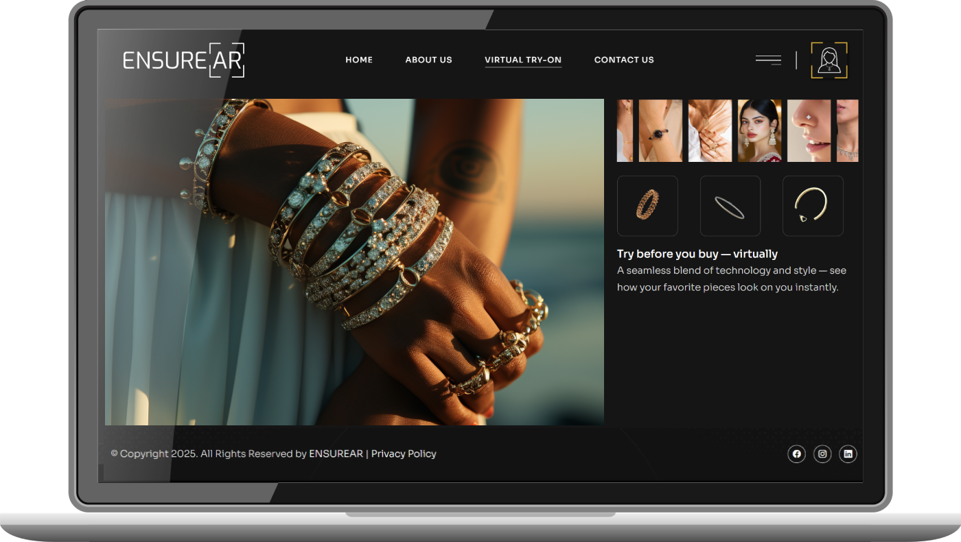 EnsureAR is a cutting-edge AR technology company that delivers immersive Virtual Try-On solutions for jewellery, watches, and eyewear — empowering customers to visualize products in real time, shop with confidence, and experience a seamless blend of style and technology. With advanced precision and realistic rendering, our solutions bring every detail to life.